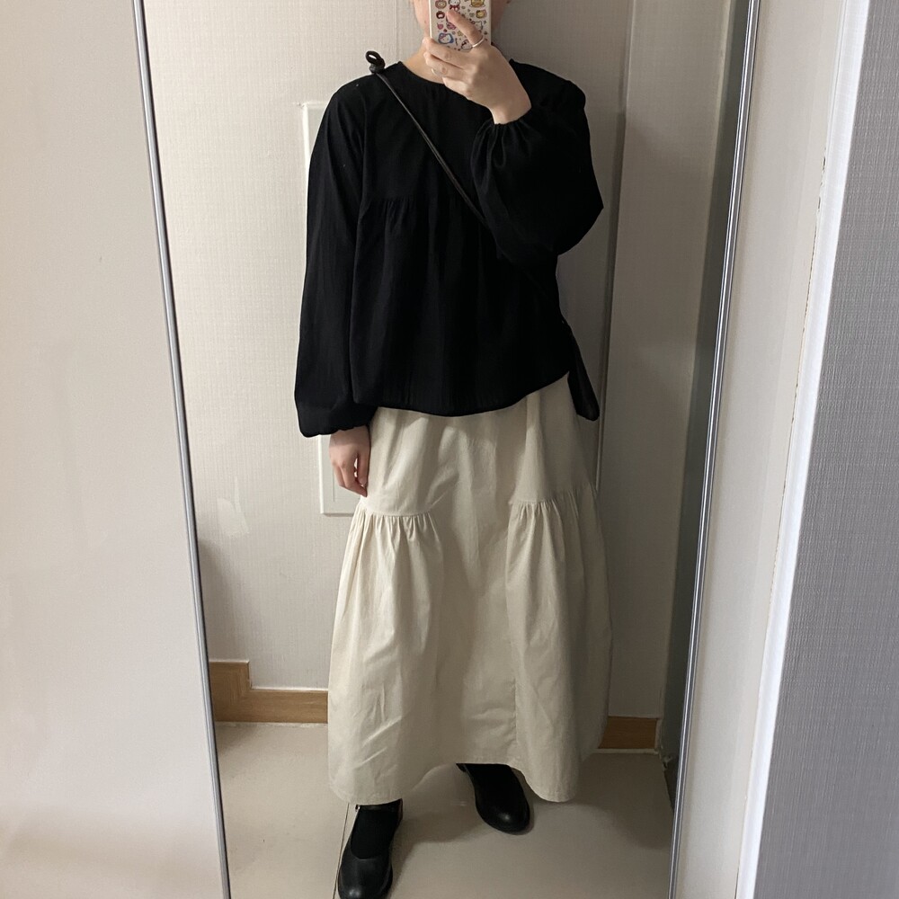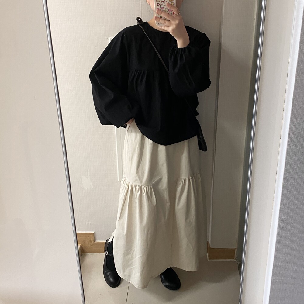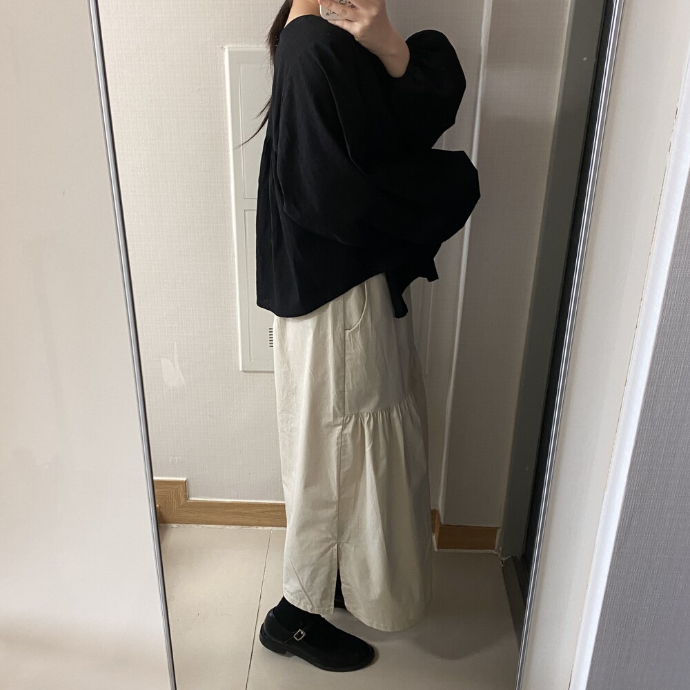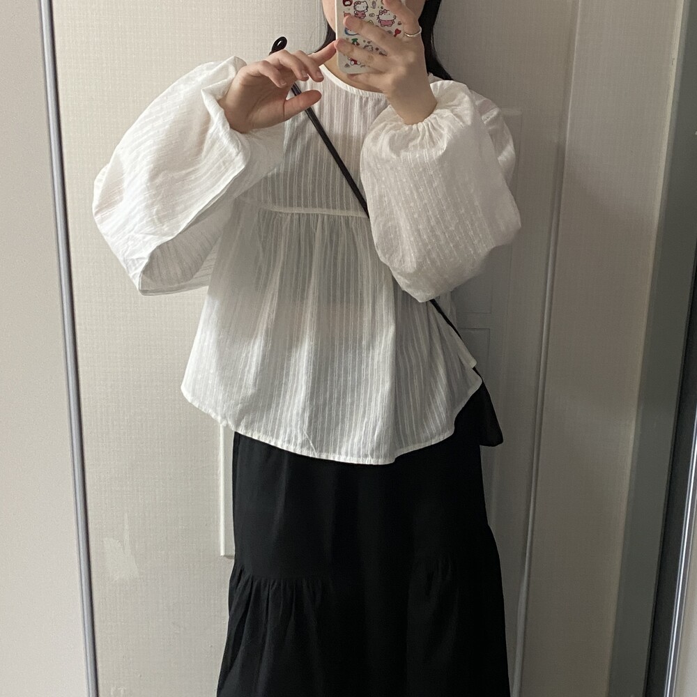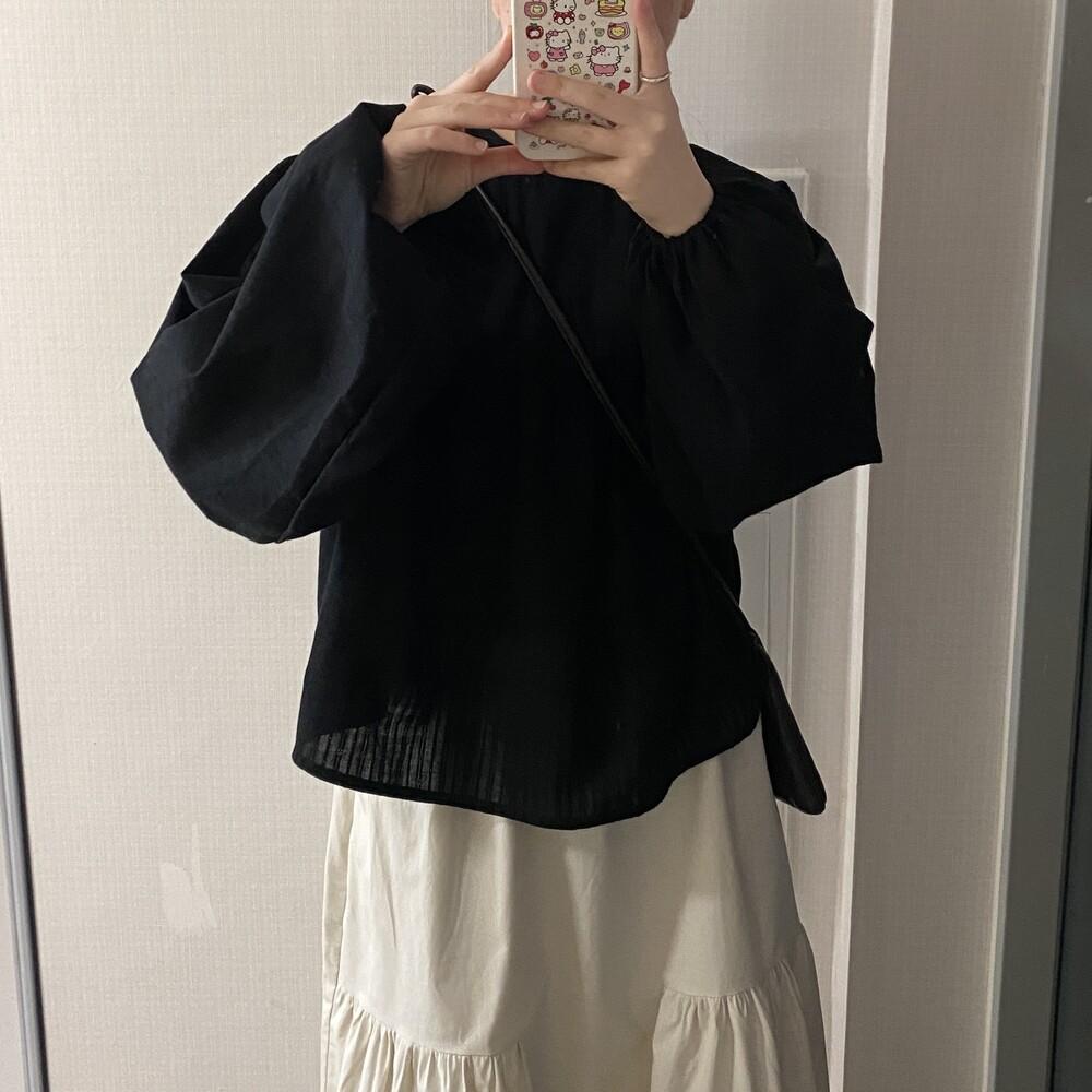 소매 밴딩 마감으로 낭낭한 벌룬핏 소매를 예쁘게 잡아주어요-
