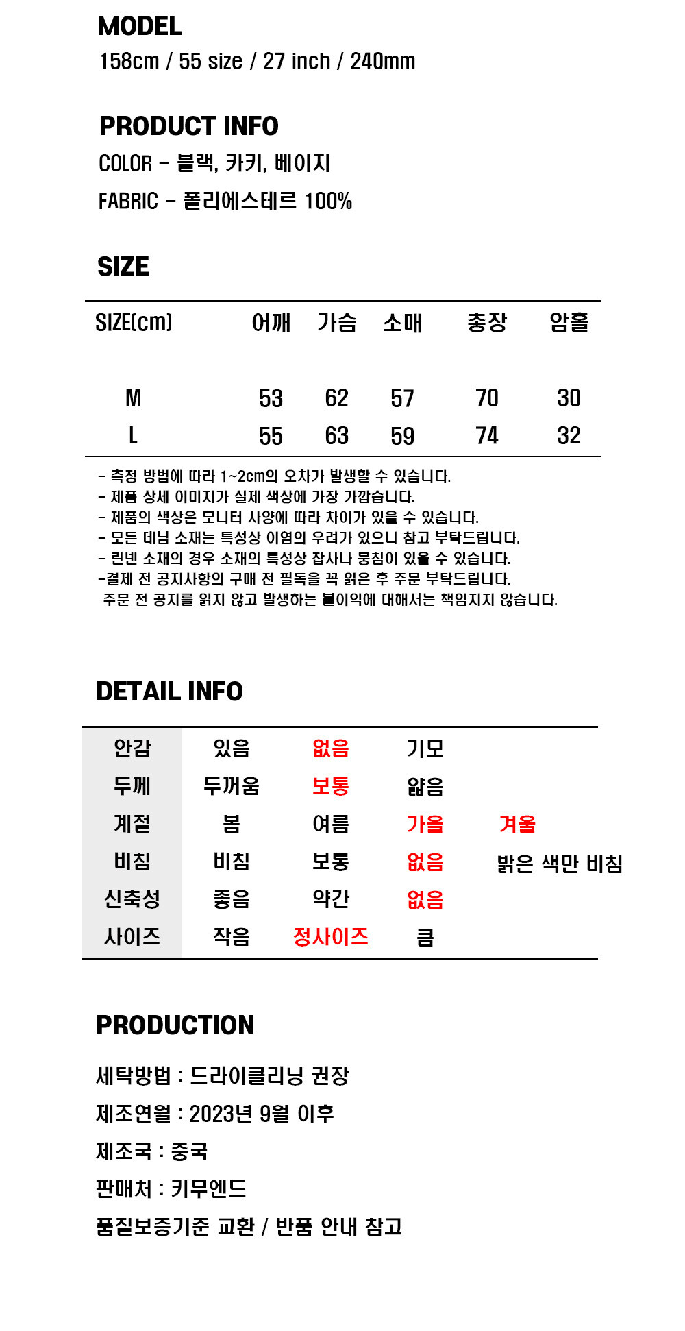 • 블랙 / 카키 / 베이지