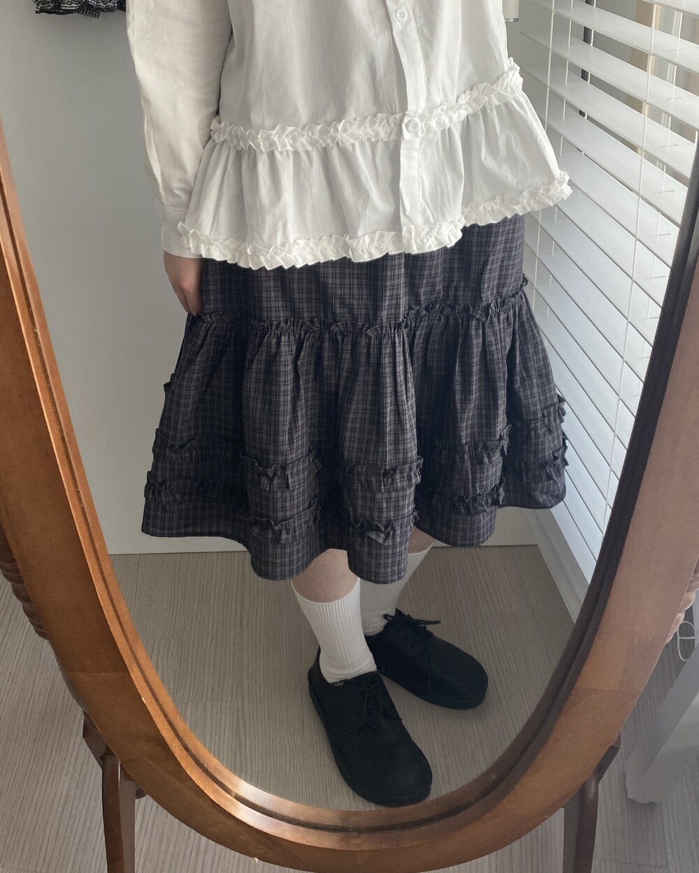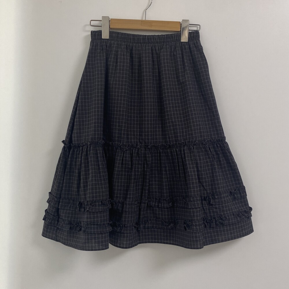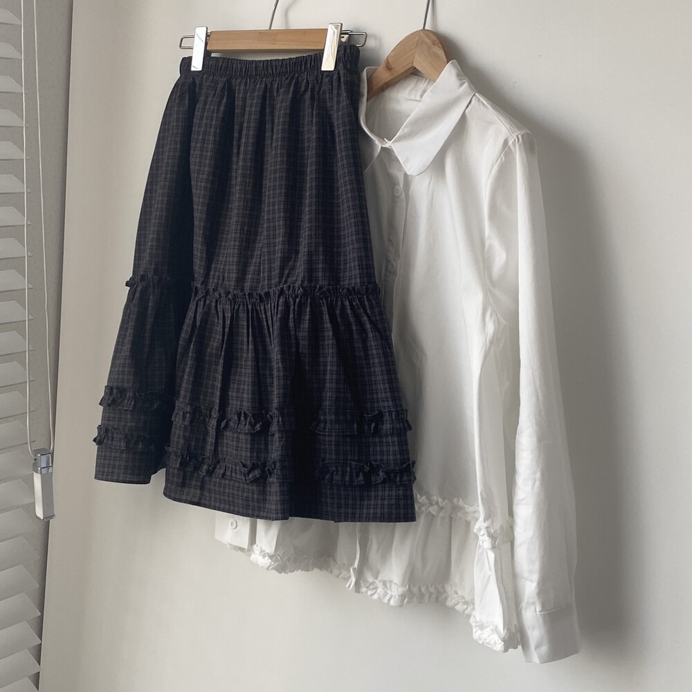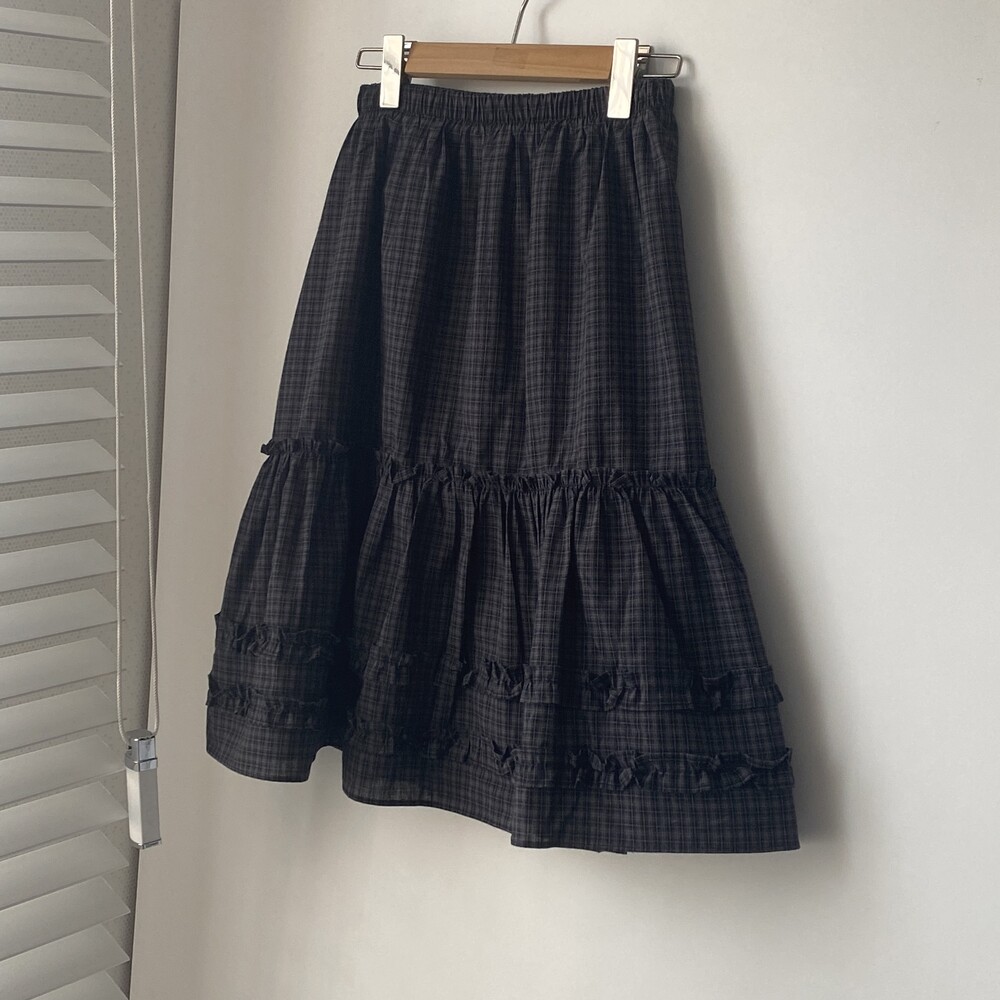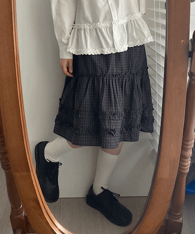 베베 프릴 체크 미디 스커트