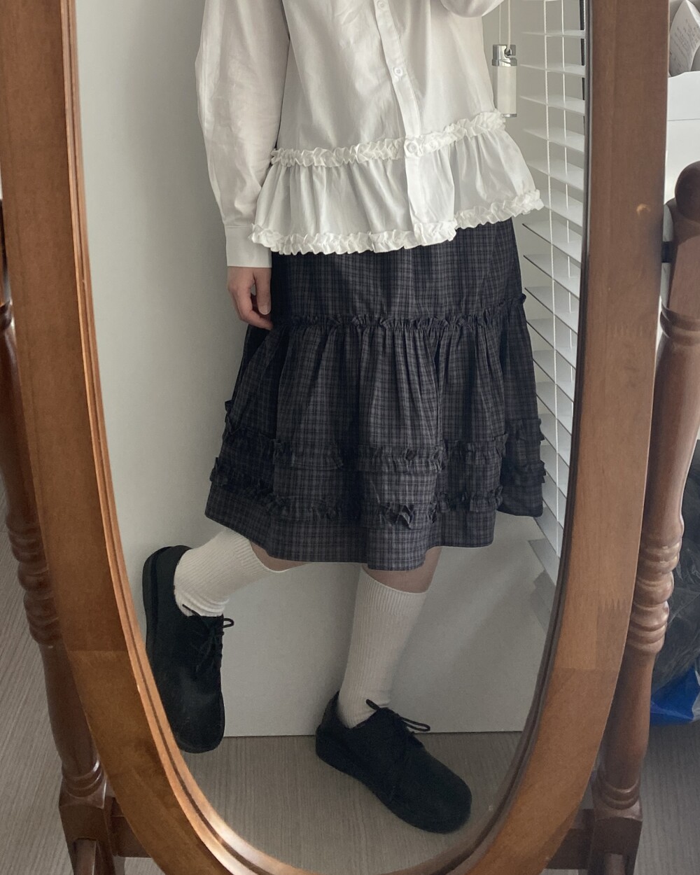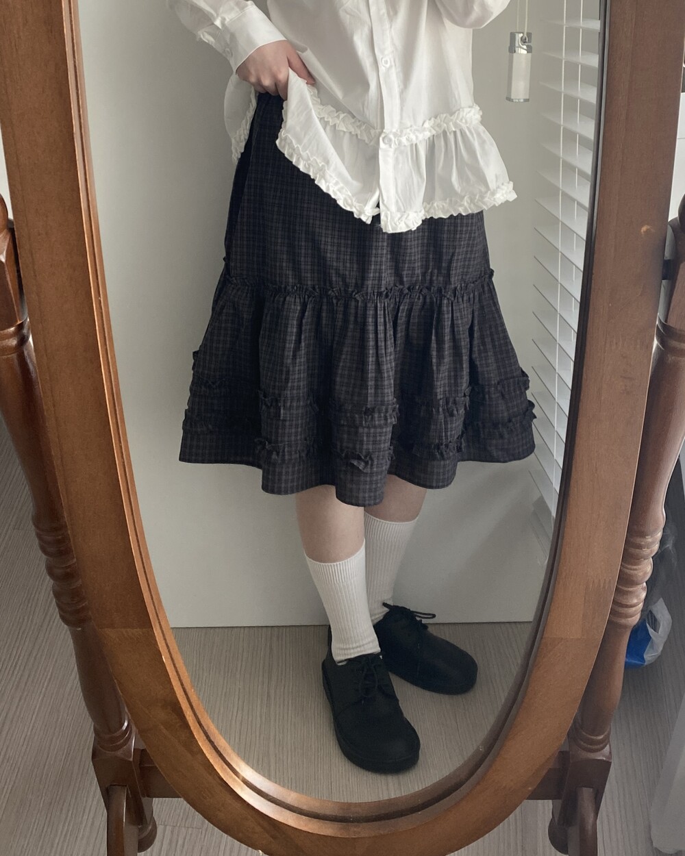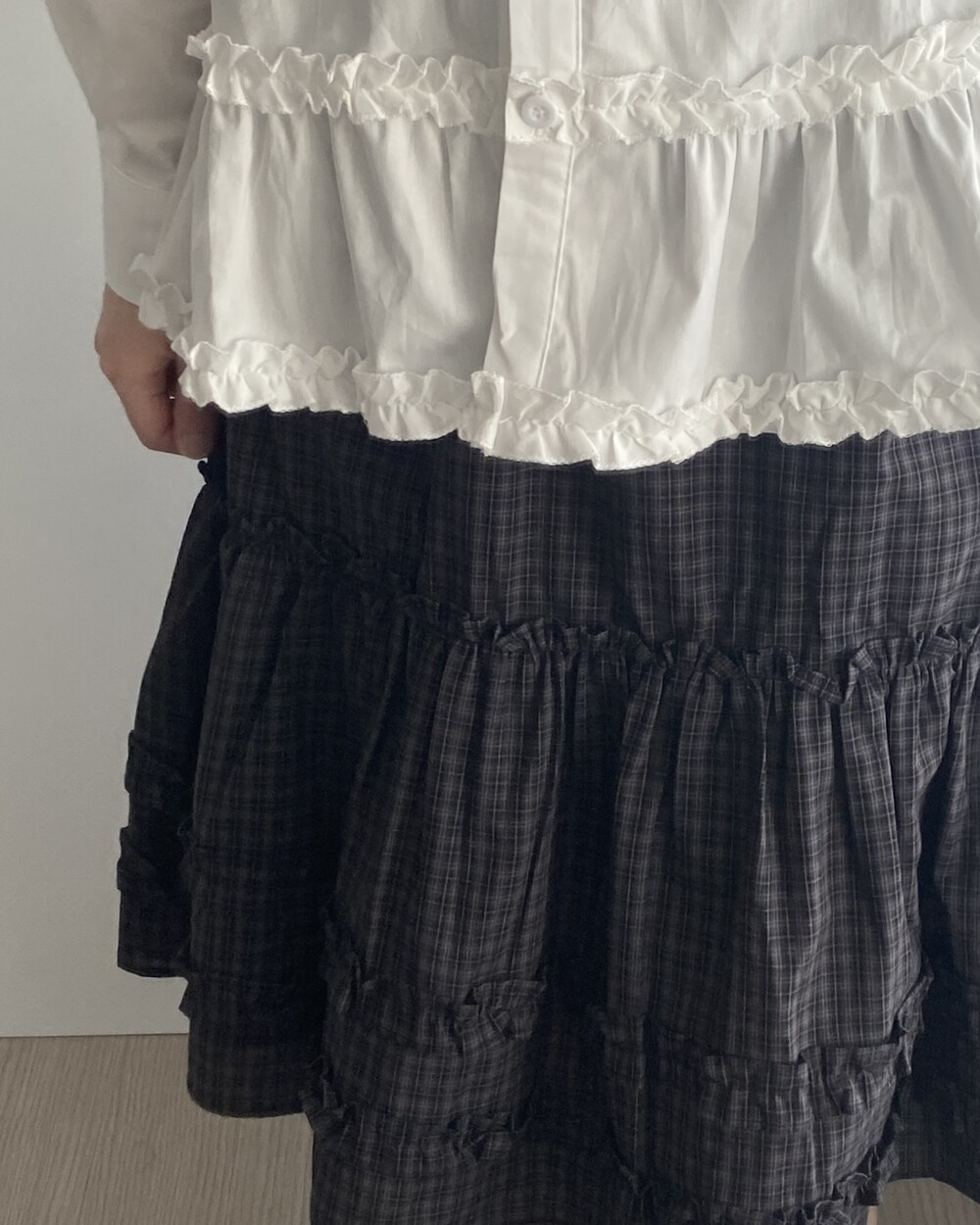 베베 프릴 체크 미디 스커트